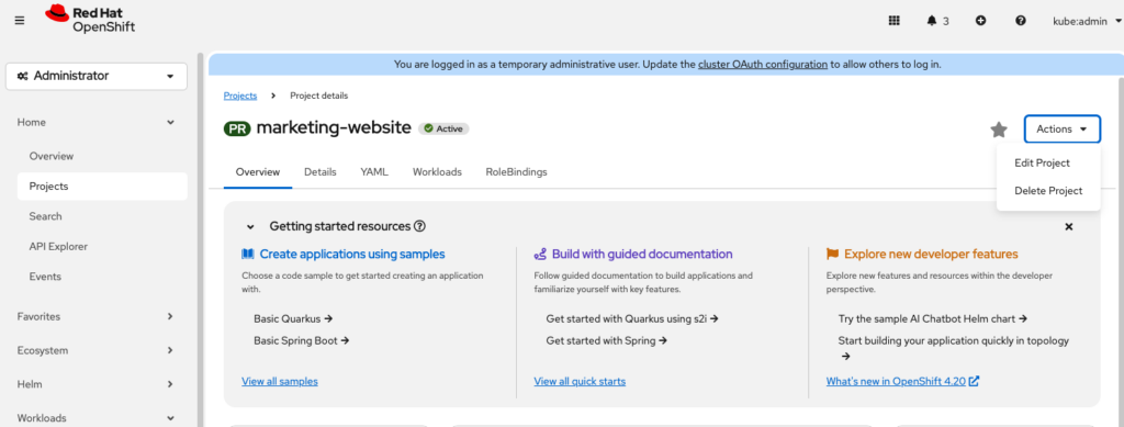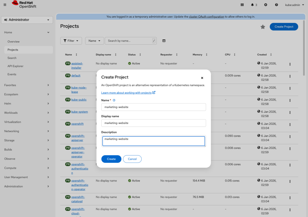 We are deploying a website for a fictitious marketing department. Lets start by creating the project namespace. Visit: Home > Projects