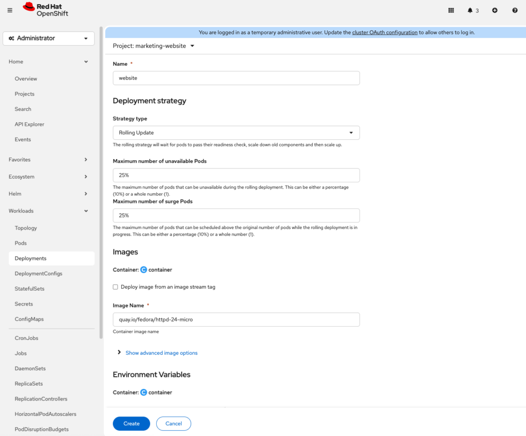 Openshift can pull images directly from external registries like Quay and Dockerhub. In this example we are using httpd image from Quay. We are creating 3 replicas (3 instances of apache for redundancy) just for kicks. Click Workloads > Deployments > Create Deployment