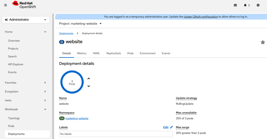 If you configured wildcard DNS as discussed earlier, your service should now be accessible by just entering (https://website-marketing-website.apps.prodcluster.demo.io) into a web browser. If not, then you would need to make a dns entry on your DNS to point this domain to your Openshift Cluster.