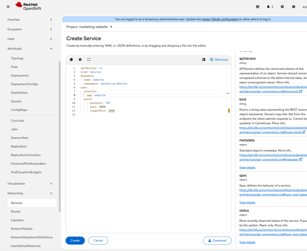 At this point, the website containers are running internally, but for them to be reachable by other services on the same cluster, we have to expose them using a service. Click Networking > Services > Create Service