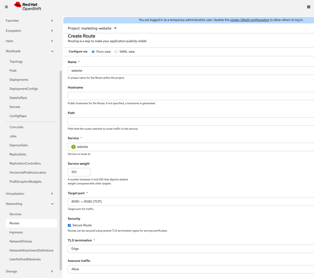 Create an OpenShift Route to make Apache accessible from outside the cluster: Click Networking > Routers > Create Route.
