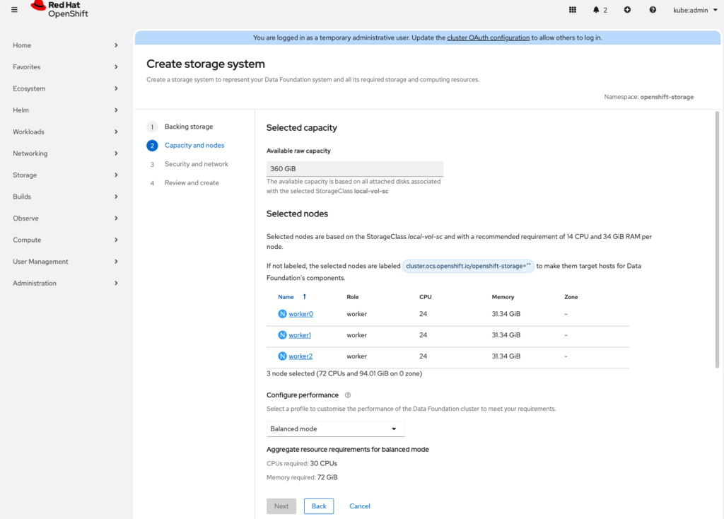 Note: On my lab infrastructure, since I was using Proxmox, I added a second disk to the worker nodes and enabled SSD emulation as well. This is important as ODF requires fast devices and will fail installation if it detects HDD drives.
