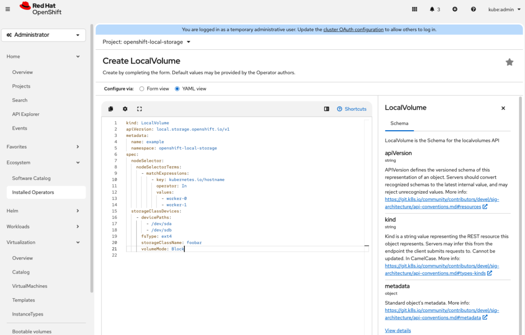 Once the local storage operator is installed, browse to “Local Volume” and click “Create LocalVolume”